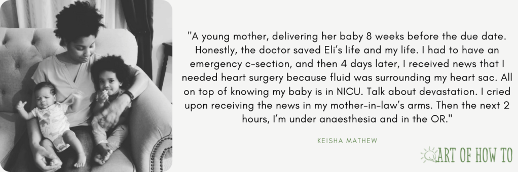 | KM | But then everything went spiralling down, out of control. While pregnant with Eli, I was feeling extremely tired and in a lot of pain. Unusual pain that differed from when I was pregnant with Eliza. I remember before I went on maternity leave, my coworkers and good friends at work would see me and they were like, ‘Keisha, you should go home. Why are you coming in? Why are you here?’ They were concerned. Apparently, I didn’t look too good to them either. One, I had to come in because I had to work, and two, I thought it was normal because of the pregnancy. I told myself and everyone, I am fine and at that point I couldn’t even walk, I was wobbly, and once I remember my colleague pushed me in the rolling chair down for office meeting. She told me, ‘you need to go home’. I keep insisting, ‘It’s just pregnancy. This pregnancy is different.’ It was nothing like my first pregnancy. Eliza’s pregnancy was easy, and I kept saying, ‘it’s just because he is a boy’ and I thought as well. I didn’t know what was in store for me. |