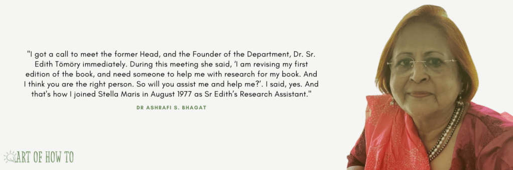 It was during one of the German classes that I got a call to meet the former Head, and the Founder of the Department, Dr. Sr. Edith Tömöry immediately. During this meeting she said, ‘I am revising my first edition of the book, and need someone to help me with research for my book. And I think you are the right person. So will you assist me and help me?’. I said, yes. And that’s how I joined Stella Maris in August 1977 as Sr Edith’s Research Assistant. I helped her with research, did illustrations, and more. In 1978, at the beginning of the next academic year, I was offered a teaching position. And the rest is history.