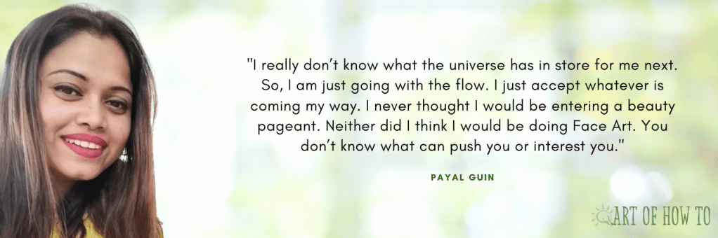 | Payal | Let me put it this way. It all started with me watching a random video of Face Art and I started learning, engaging and doing the same. After posting one video on Face Art, I received a lot of appreciation and fascinating comments on Instagram, and I just went with the flow. So, I really don’t know what the universe has in store for me next. I am just going with the flow. I just accept whatever is coming my way. I never thought I would be entering a beauty pageant. Neither did I think I would be doing Face Art. You don’t know what can push you or interest you. |