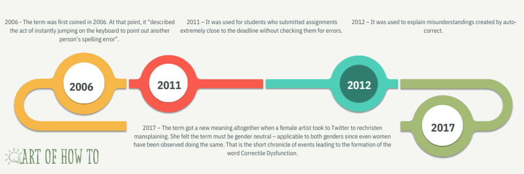 2006 The term was first coined in 2006. At that point, it “described the act of instantly jumping on the keyboard to point out another person’s spelling error”. 2011 It was used for students who submitted assignments extremely close to the deadline without checking them for errors. 2012 It was used to explain misunderstandings created by auto-correct. 2017 The term got a new meaning altogether when a female artist took to Twitter to rechristen mansplaining. She felt the term must be gender neutral – applicable to both genders since even women have been observed doing the same.