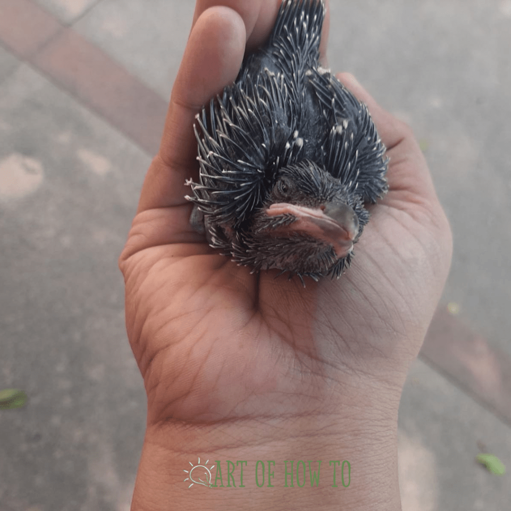 I saw many small pairs of eyes staring at me – some straining their necks to see me, reaching out to touch me with their hands. I got scared and retreated into the grass. I started feeling sleepy and went into a deep sleep. A while later, I found it all dark around me after I awoke. It had started raining heavily. I got scared and started crying. I became hungry and started shivering because of the cold too. I kept crying through the night. When I fell, I almost thought I would not have survived the fall. Throughout, I kept remembering the time my mother used to teach me to fly. Sigh! If only I had learned to fly!