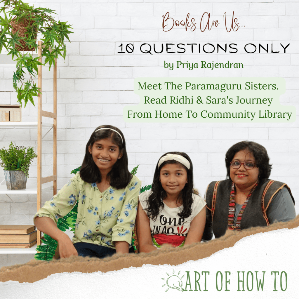 Meet Ridhi and Sara, book lovers and avid readers from Tamil Nadu, South India. Read the Paramaguru Sisters Journey of setting up a Community Library in their commune. Priya Rajendran asks 10 Questions Only, and the sisters have made an excellent plan for the community they live with, encouraging and making everyone participate. Let's discover more.